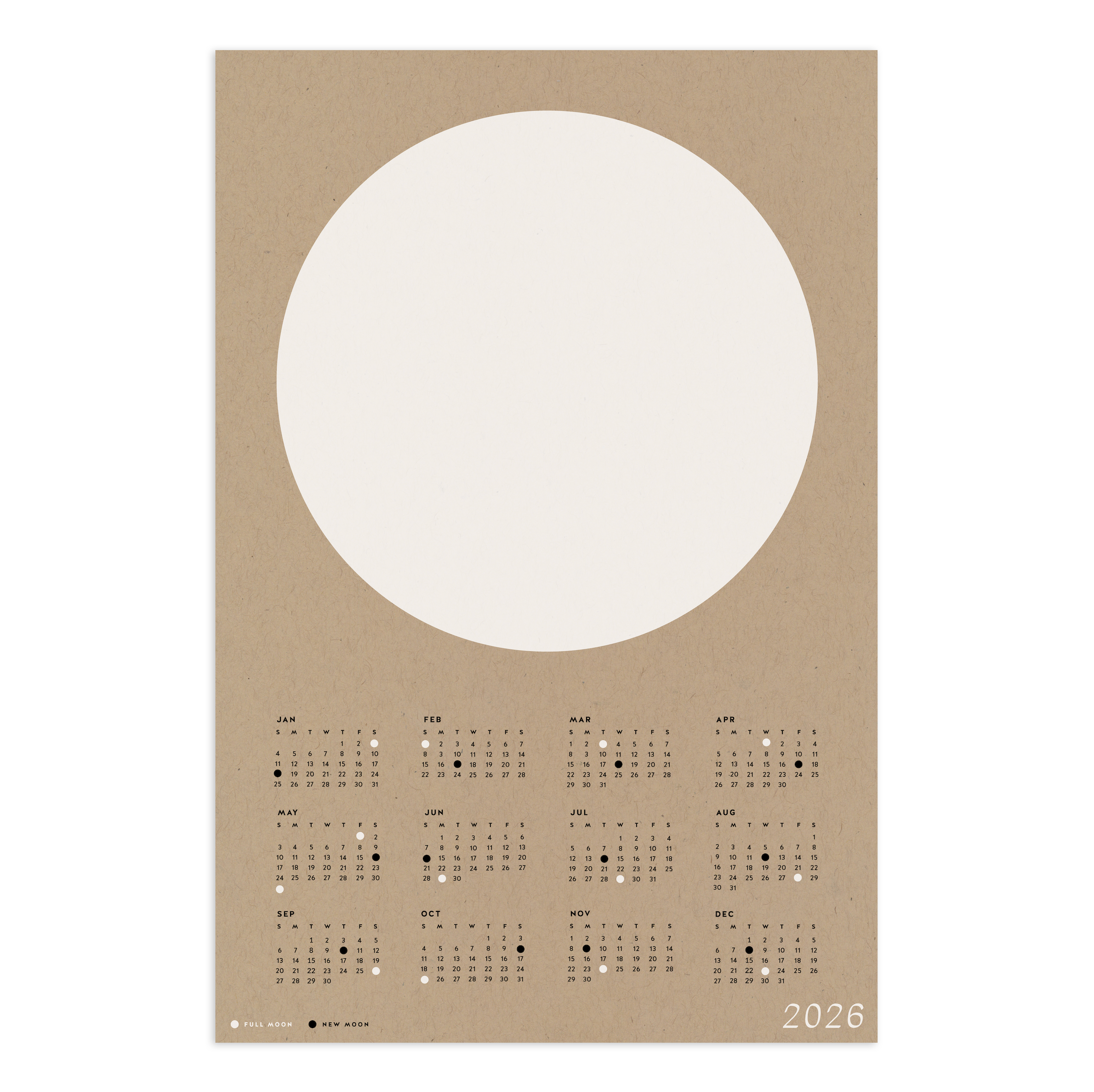 For those who love observing the rhythms of nature, this minimalist moon calendar poster is perfect for hanging in a bedroom, near your altar, along a hallway, in a nursery, or anywhere in your home. A simple and fresh monthly 2026 calendar layout allows you to see at a glance the day of the week the new and full moons fall on. The full moons are indicated by the solid white circles, the new moons are indicated by the solid black circles. Information on the moon phase dates were sourced from the NASA sky events calendar for 2026.