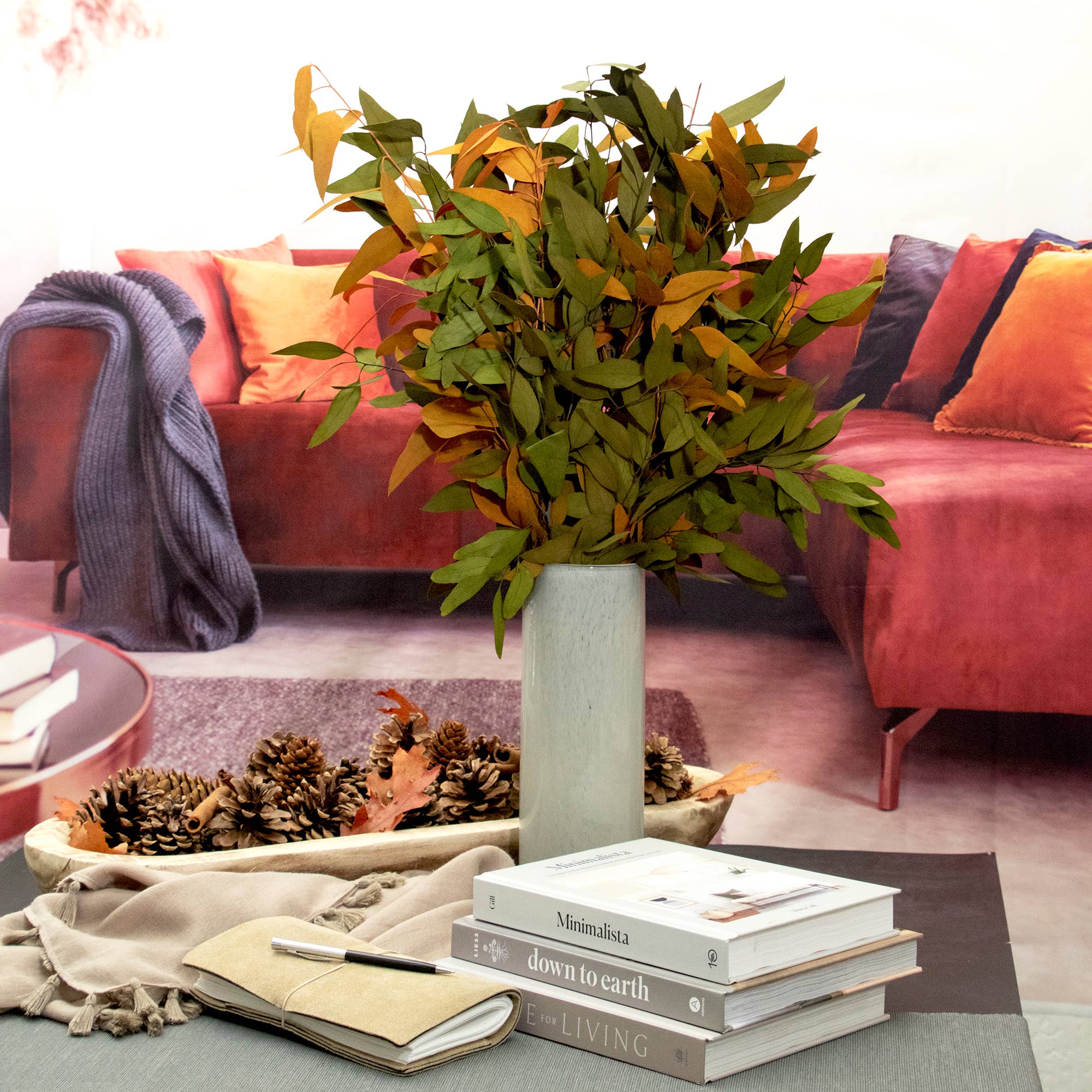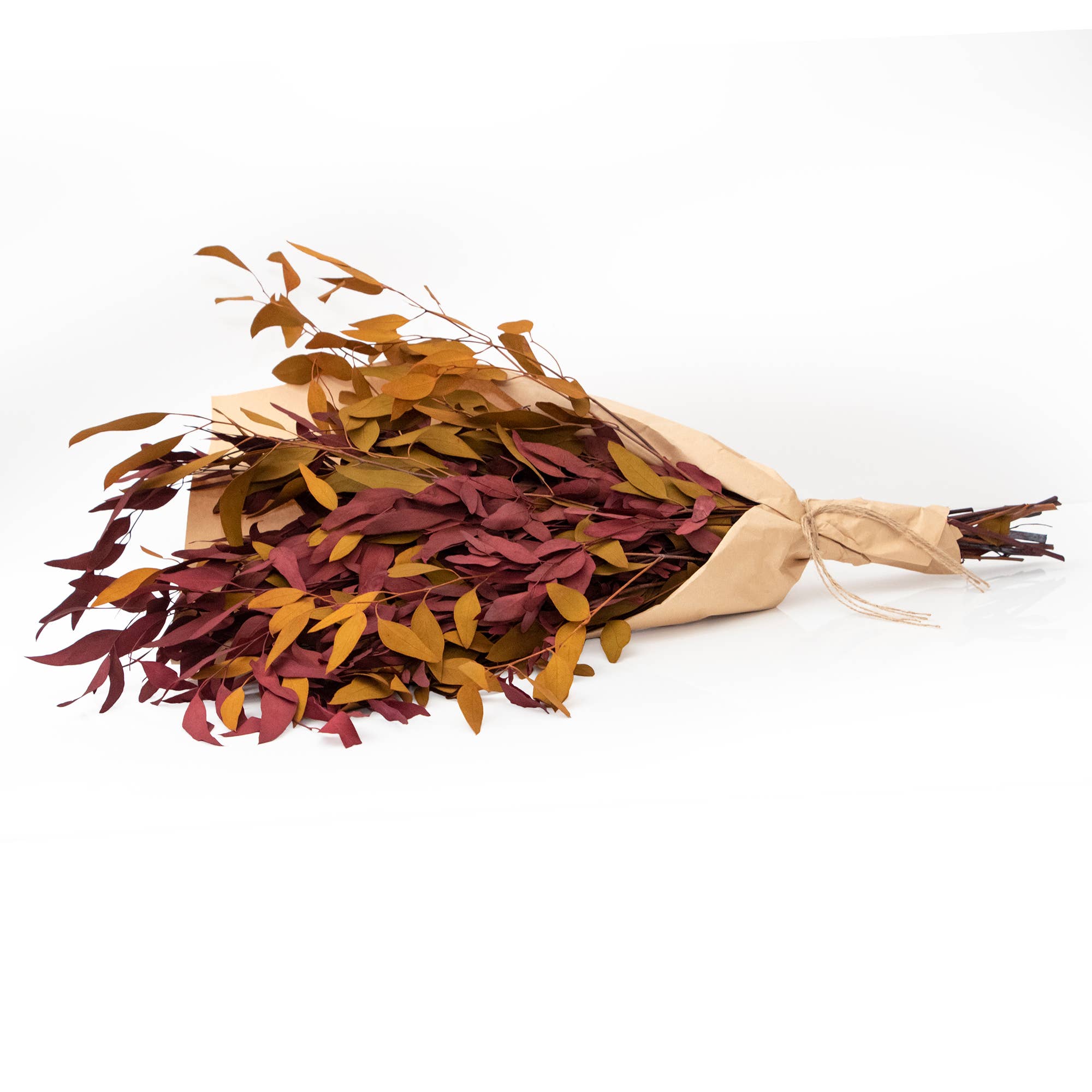 For fall, we designed these rustic bundles of mixed colors of natural willow to add an air of autumn to your space. This bundle uses preserved willow with a touch of dye to create all the different colors. - 10 oz bundles - Wrapped in kraft paper - Preserved willow eucalyptus