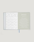 What's Inside: • 12 Monthly Intentions – A new word to center your month around + guided prompts to dive deeper. • Monthly Calendar Spreads – Dated calendar layouts featuring key dates, holidays, moon phases and astrology seasons. • Weekly Planning Spreads – Dated weekly spreads to prioritize and a weekly quote to stay inspired • Monthly + Seasonal Reflections – Guided prompts to look back Details: • 6.75’’ x 9.5’’ • 236 pages • Hard + soft cover, foil stamped • Front inner pocket + dual ribbon page markers • Layflat binding • Protective sleeve • Mindfully made of recycled paper created with PCW