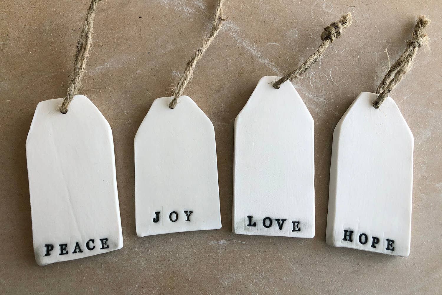 Each of these tags is hand cut from porcelain clay. The tags are stamped then the text is emphasized with a black under glaze. They are finished with a piece of jute. No two are ever the same. They make great ornaments, gift tag keep sakes or are perfect around the neck of a bottle of wine as an extra gift.