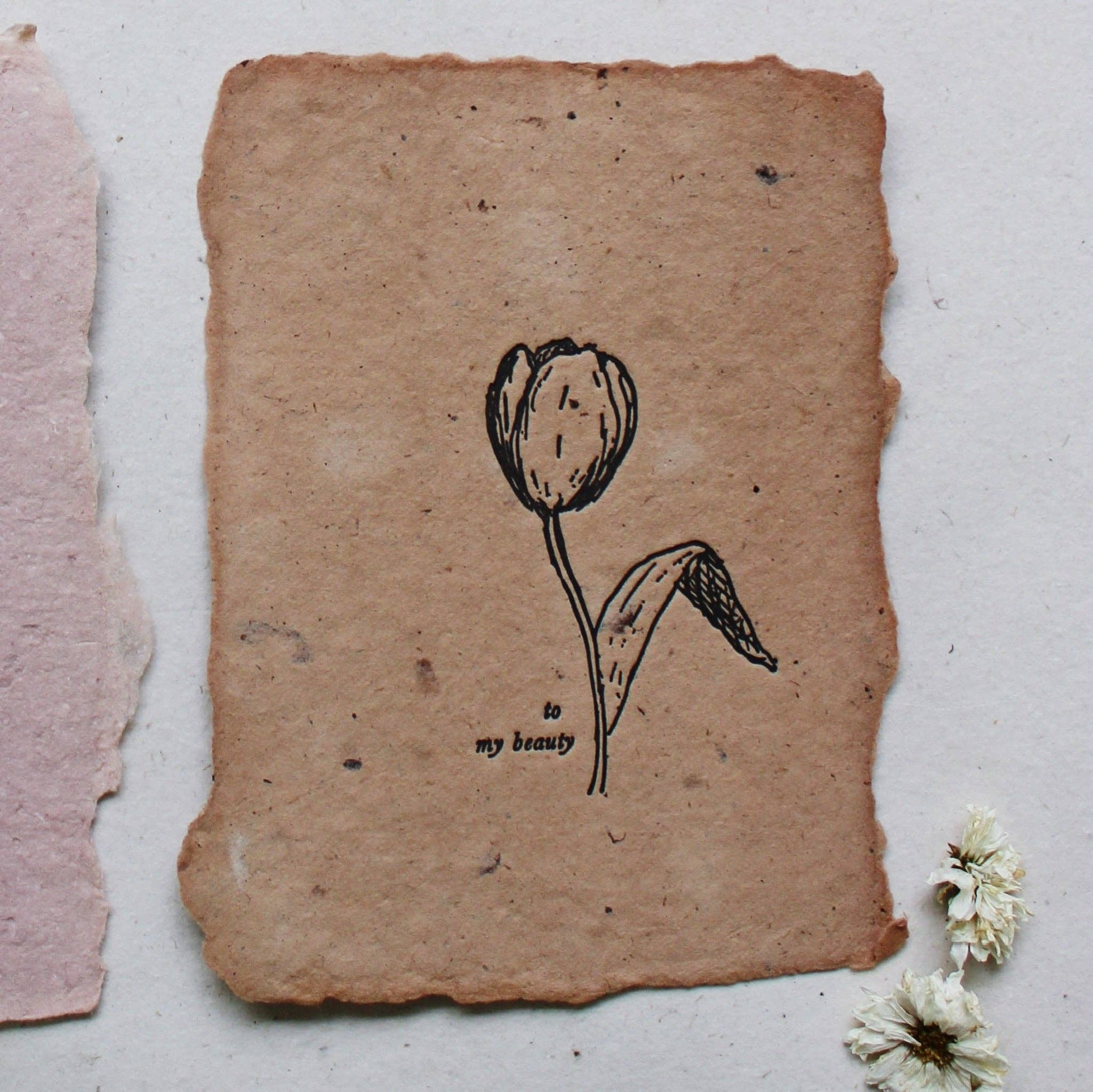 to my beauty notecard - Sketch illustration of a tulip with the words “to my beauty" letterpressed in black ink on terra cotta handmade paper