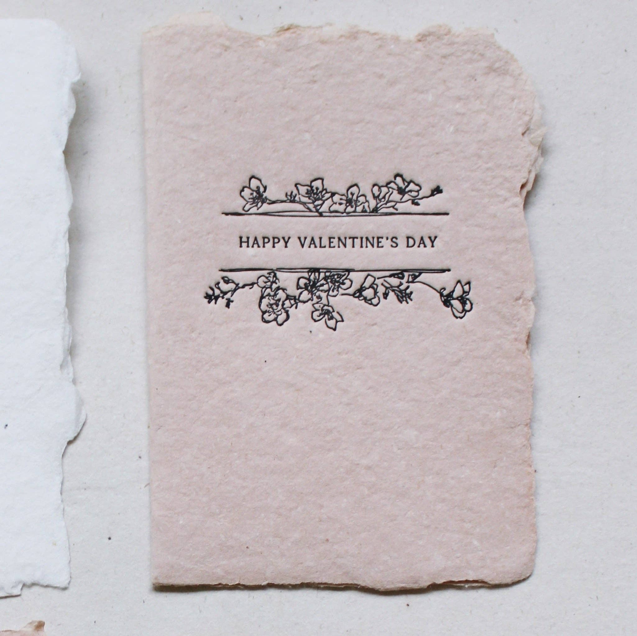 happy valentine's day serif folded card- floral illustrated frame around “happy valentine’s day” letterpressed in black ink on blush handmade paper